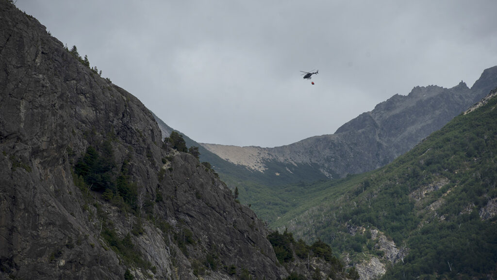 Brigadistas y helicópteros combaten el incendio en el Parque Nacional Nahuel Huapi