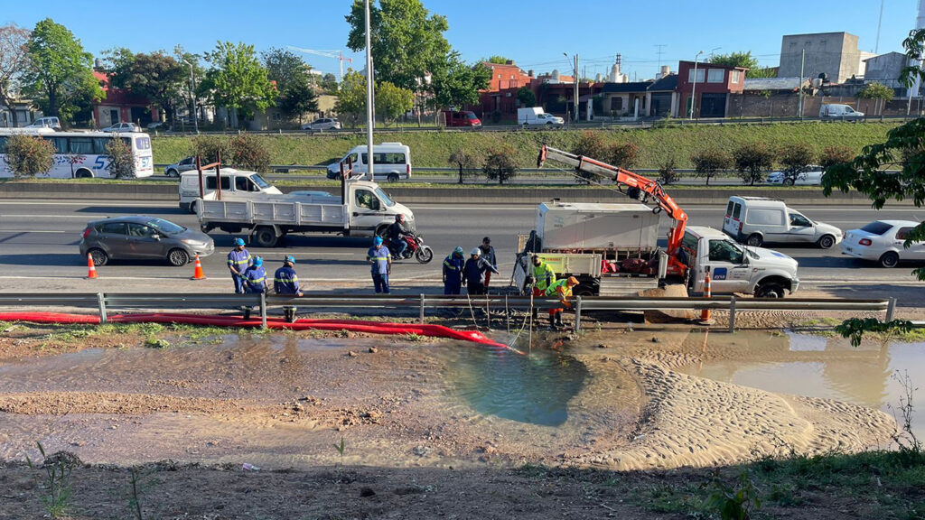 AySA trabaja en la reparación de un caño de agua en el Acceso Oeste