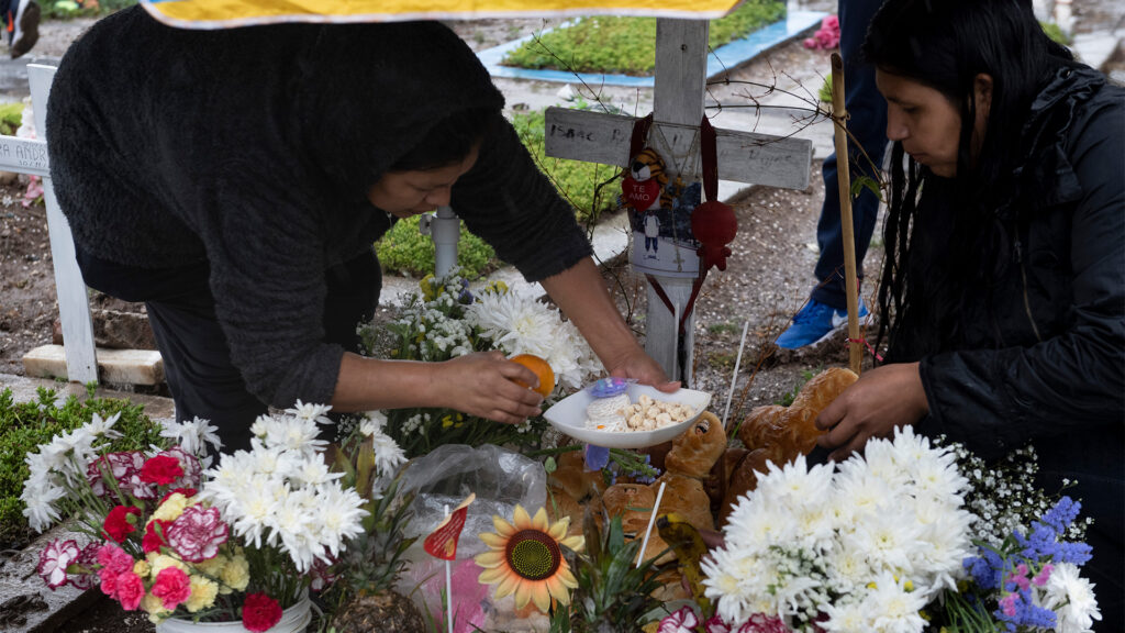 Familias celebraron bajo la lluvia el Día de los Muertos en el cementerio de Flores