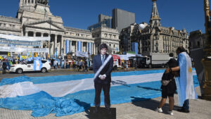 La mayoría de los manifestantes llevan banderas argentinas e insignias de La Libertad Avanza. Se ubicaron frente a las escalinatas...