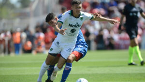 Nicolás Orsini, de cabeza, marcó el tanto de los santafesinos, a los 50 minutos del segundo tiempo.