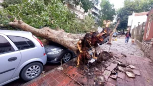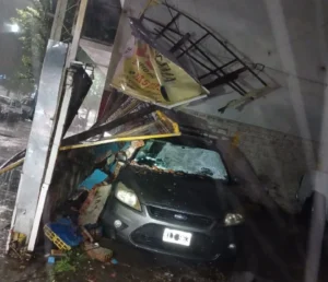 Cartel de cochera se desplomó y destruyó un Ford Focus en Colón y Santiago del Estero