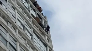 Defensa Civil y equipo de rescate en altura trabajan para retirar mampostería con riesgo de caída